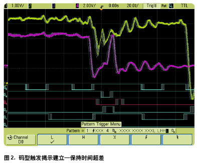 一旦我們發(fā)現(xiàn)電路存在非預(yù)期的行為就可開(kāi)始進(jìn)一步調(diào)試我們的系統(tǒng)。使用混合信號(hào)示波器(MSO)的邏輯通道就能設(shè)置跨多個(gè)模擬和數(shù)字通道的組合邏輯碼型觸發(fā)條件。它揭示由于時(shí)鐘抖動(dòng)我們的系統(tǒng)偶爾出現(xiàn)對(duì)建立 保持時(shí)間指標(biāo)的超差如圖2 所示。