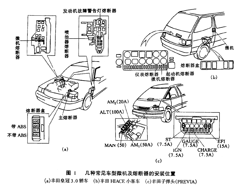 。1)在檢測(cè)之前,數(shù)顯測(cè)振儀應(yīng)先檢查汽車微機(jī)控制系統(tǒng)及其他電氣系統(tǒng)各熔斷器、熔斷絲及有關(guān)的線束插頭(連接器)是否良好。幾種常見(jiàn)車型微機(jī)及熔斷器的安裝位置如圖 1所示其他車型參見(jiàn)維修手冊(cè)。
